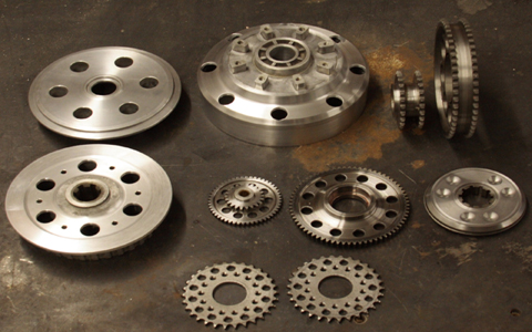 The cam wheels in the bottom of the picture have been lightened, polished and drilled to allow for very precise cam timing.